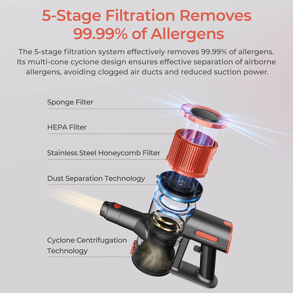 Bezdrátový vysavač JIGOO C200, vybavený nejmodernějším bezkartáčovým motorem, nabízí výjimečnou účinnost a odolnost, což z něj činí ideální volbu pro důkladné úklid domácnosti. Díky svému působivému 350W motoru generuje silný sací výkon 23 kPa, který bez námahy zvládne i tu nejodolnější špínu a nečistoty. JIGOO C200 je vybaven sofistikovaným 5stupňovým filtračním systémem, který účinně zachycuje 99,99 % alergenů a zajišťuje tak zdravější životní prostředí. Jeho inovativní technologie vířivého filtru s více kužely zlepšuje oddělování částic ve vzduchu, zabraňuje ucpávání vzduchového kanálu a udržuje optimální sací výkon.